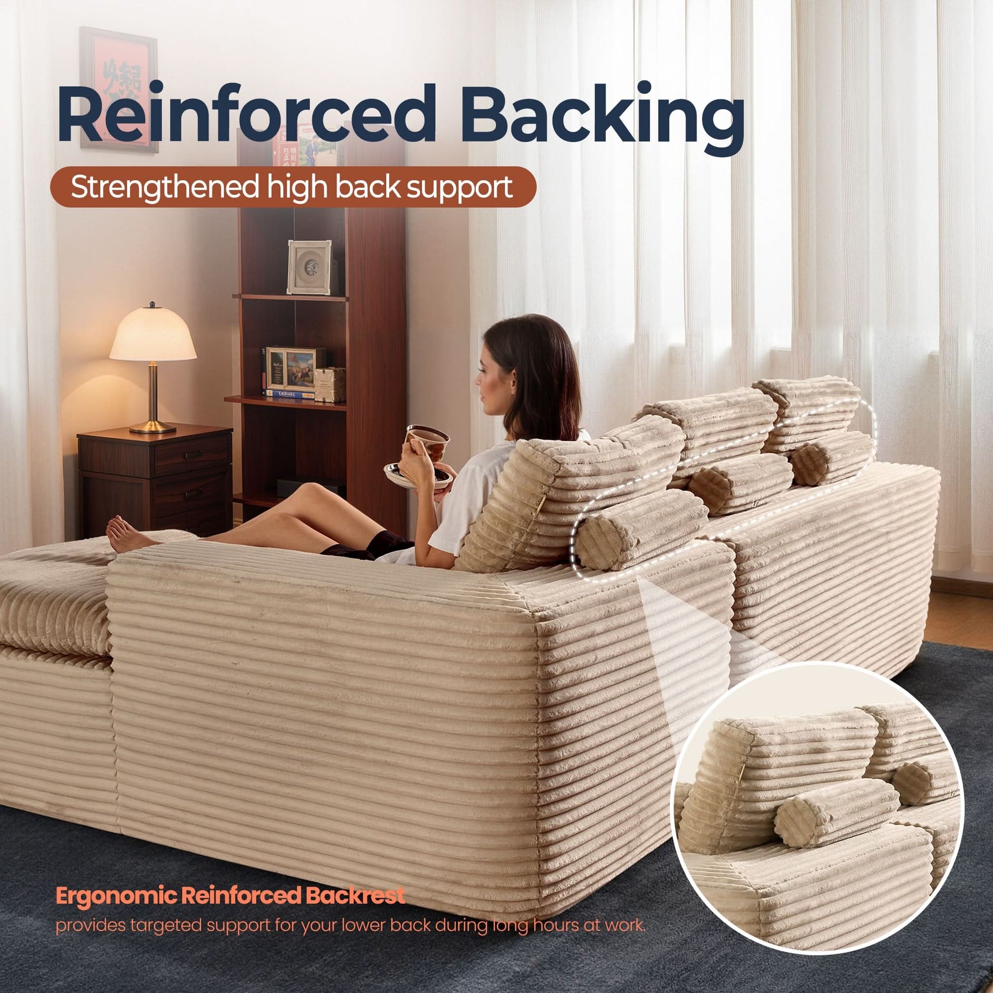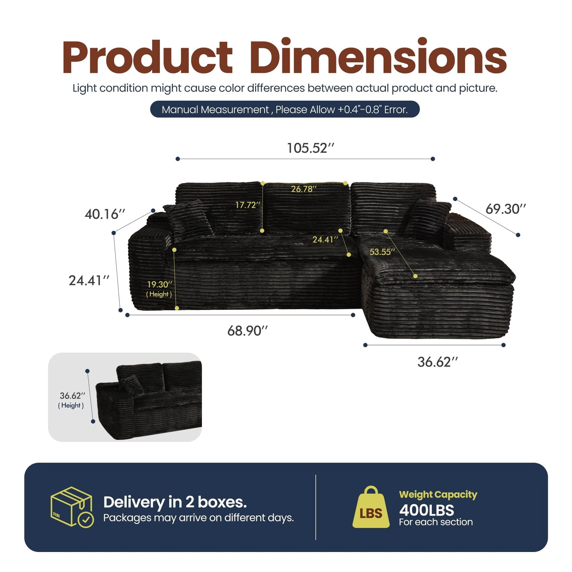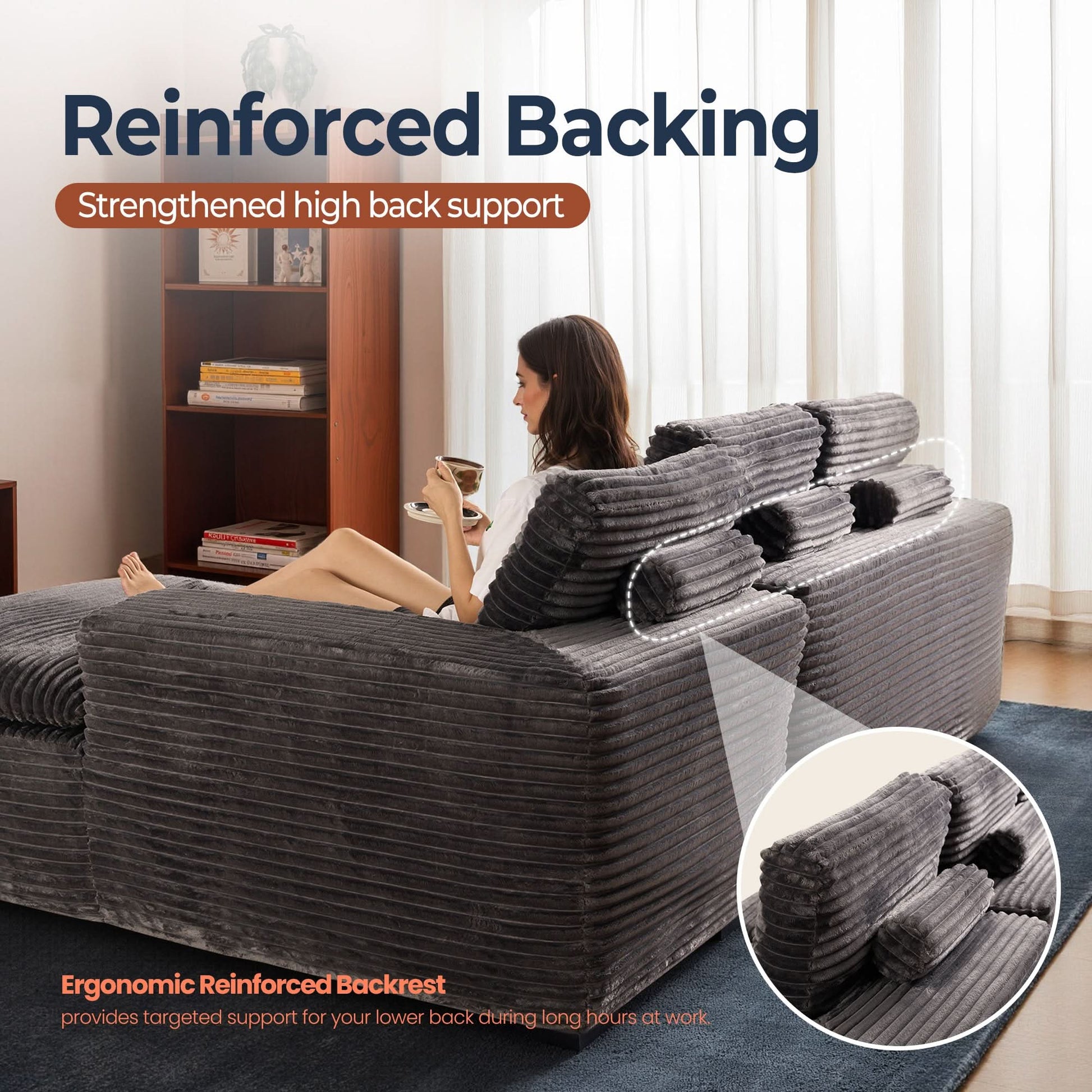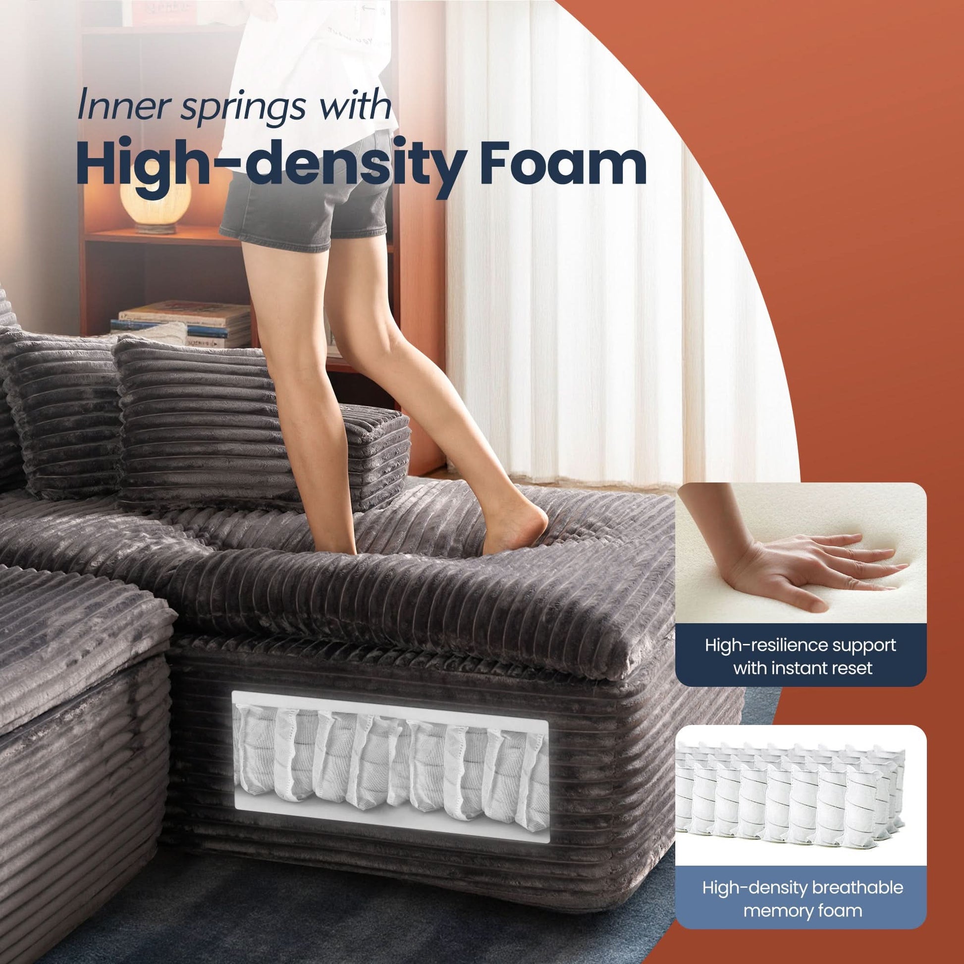 No Assembly Required:With our modular cloud chaise, assembly is a breeze—just unbox, fluff each piece, and let it spring back to shape. Full recovery takes about 72 hours. Enjoy the ease of zero setup!
