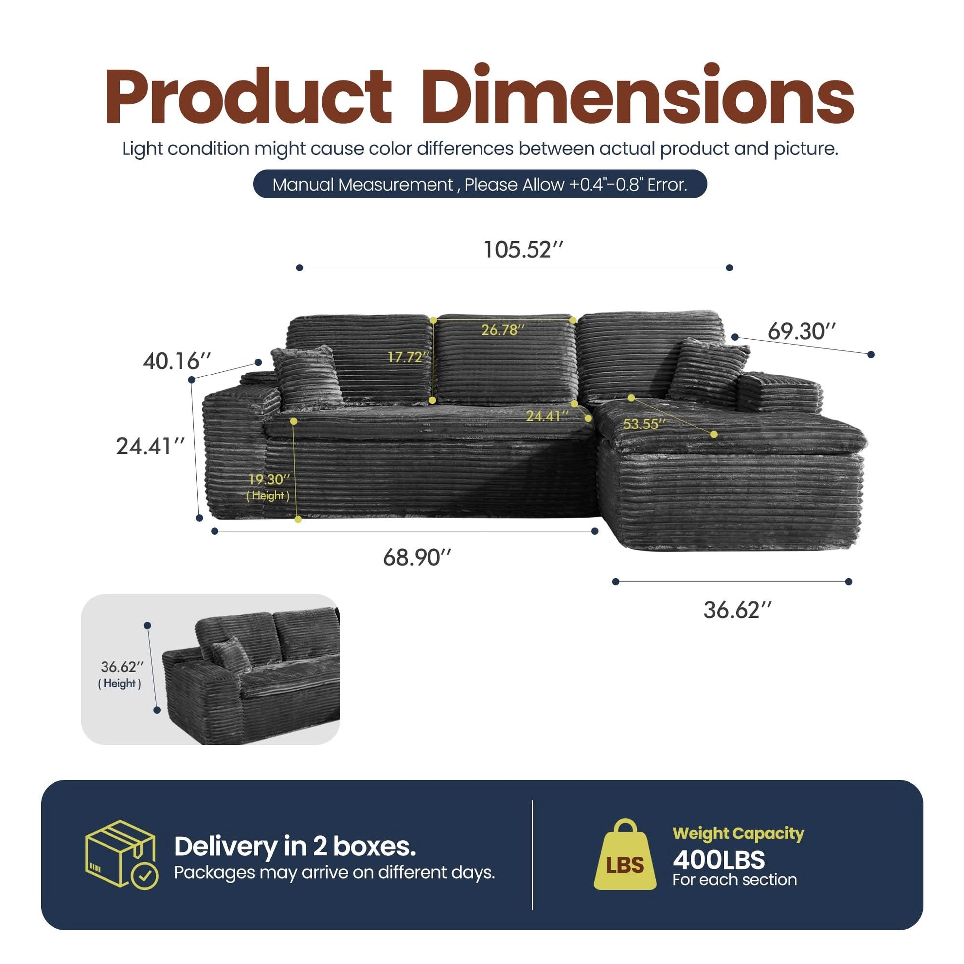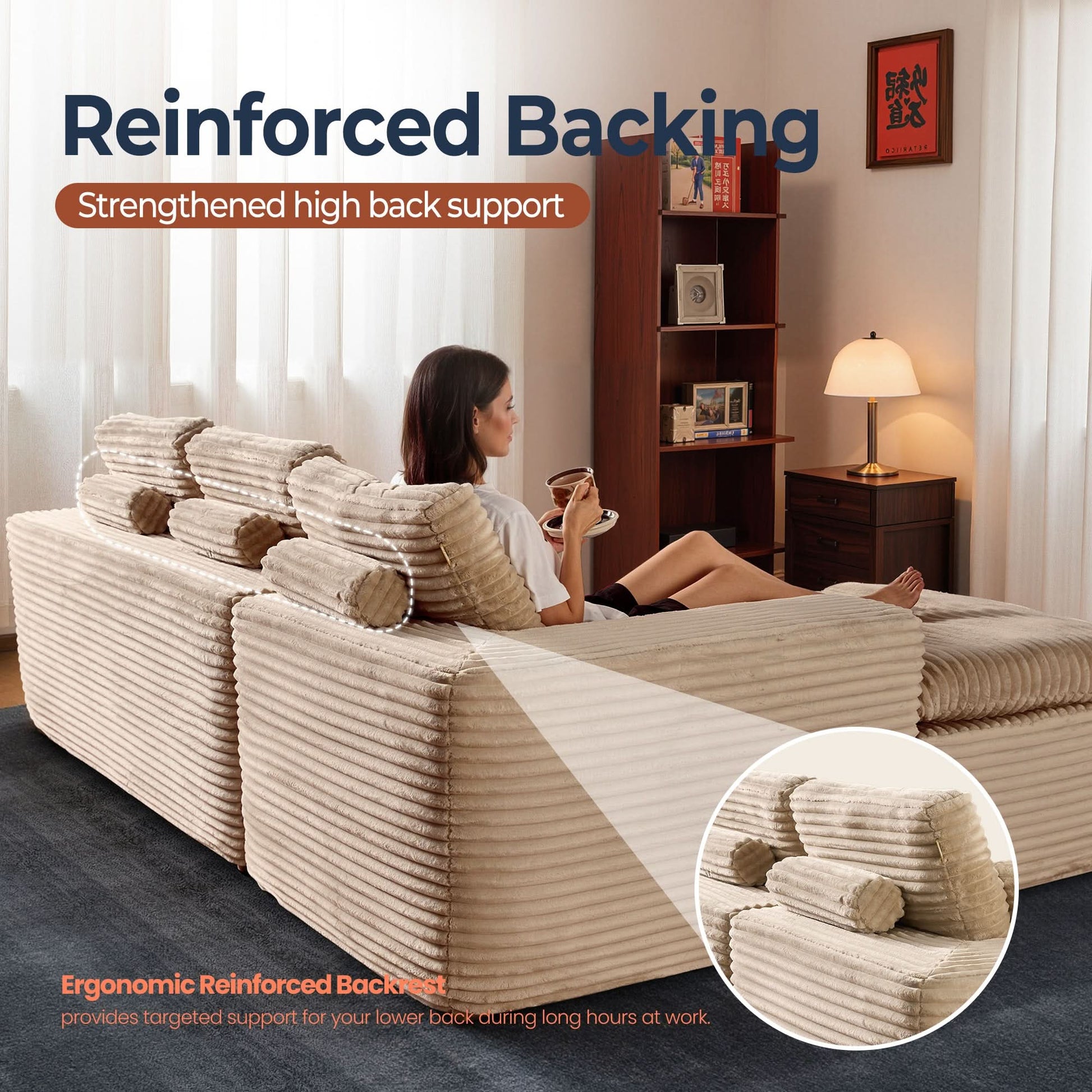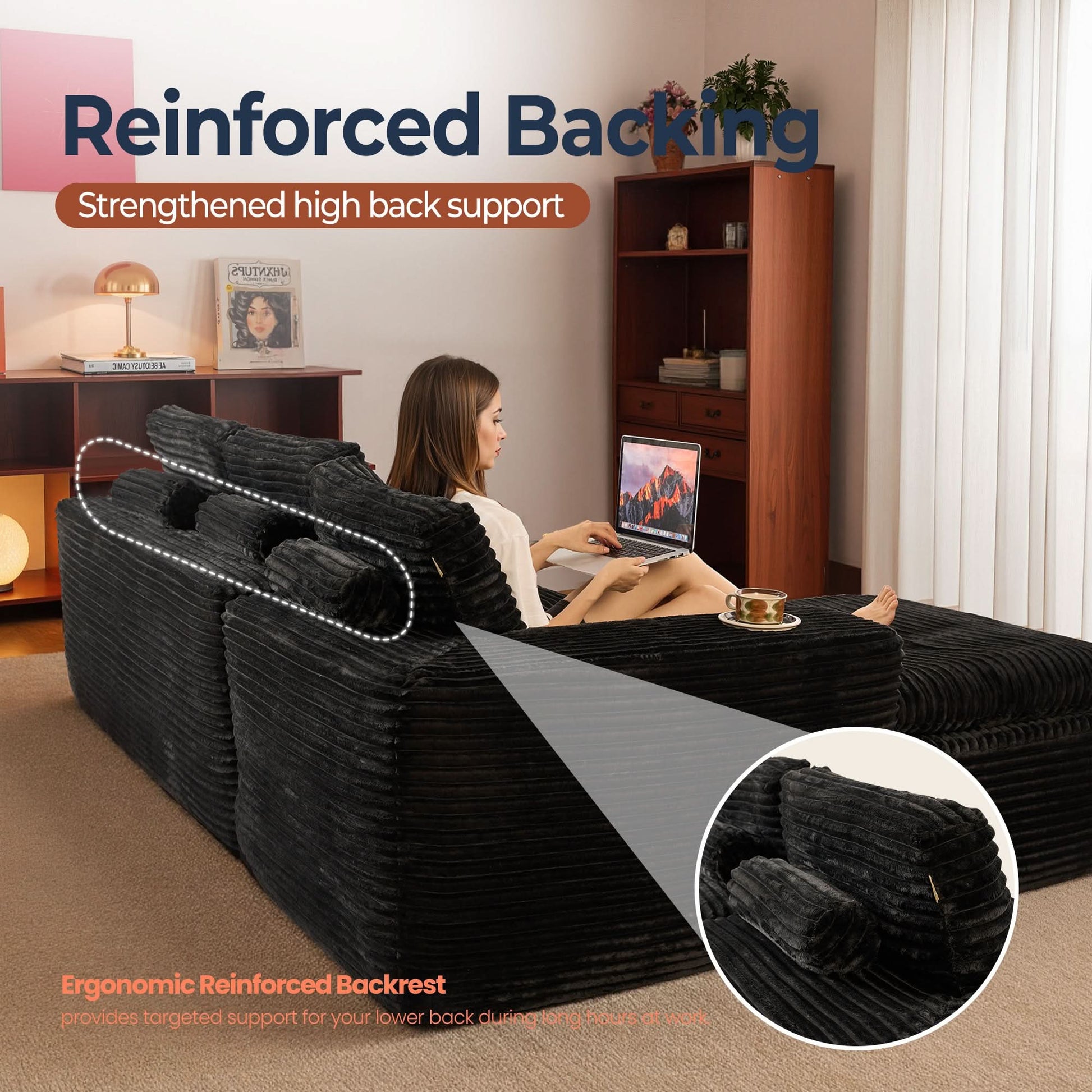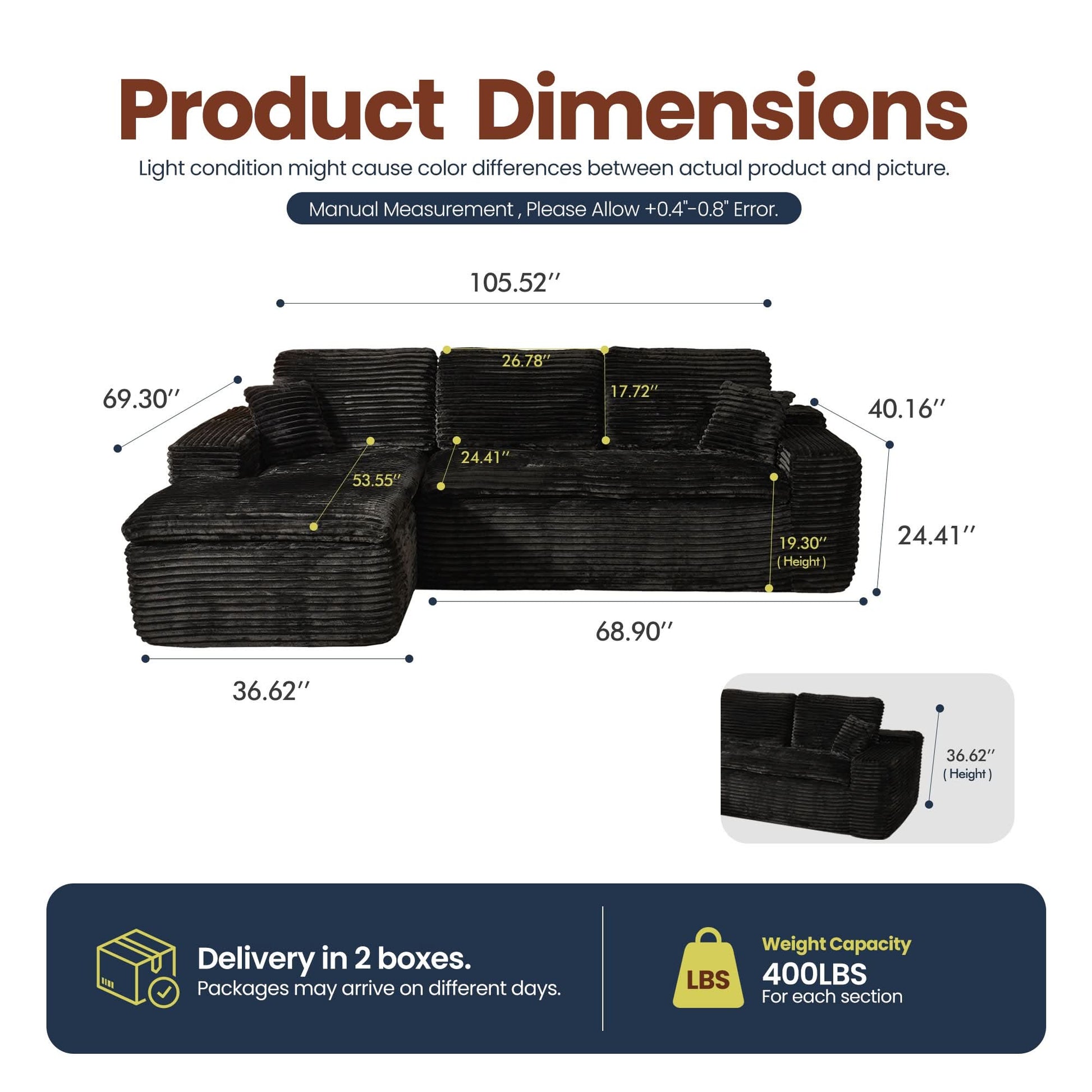 No Assembly Required:With our modular cloud chaise, assembly is a breeze—just unbox, fluff each piece, and let it spring back to shape. Full recovery takes about 72 hours. Enjoy the ease of zero setup!
